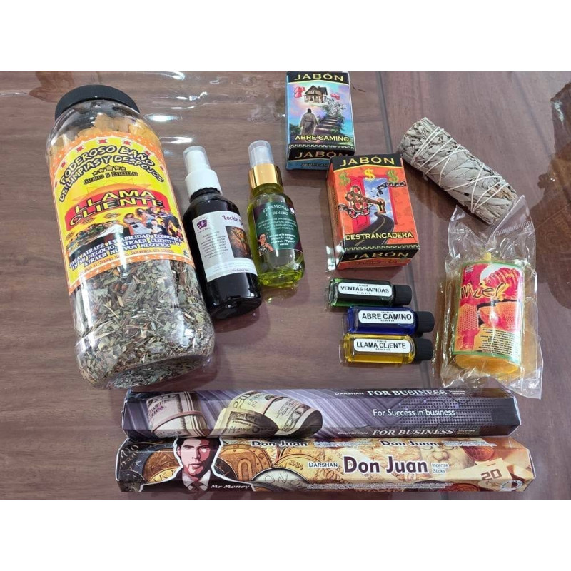 Incluye: 1 BAÑO RITUALIZADO , 1 LOCIÓN 520 , 1 FEROMONAS DE DINERO, 3 ACEITES , 2 JABONES , 1 ATADITO, 1 VELA MIEL , 2 INCIENSOS