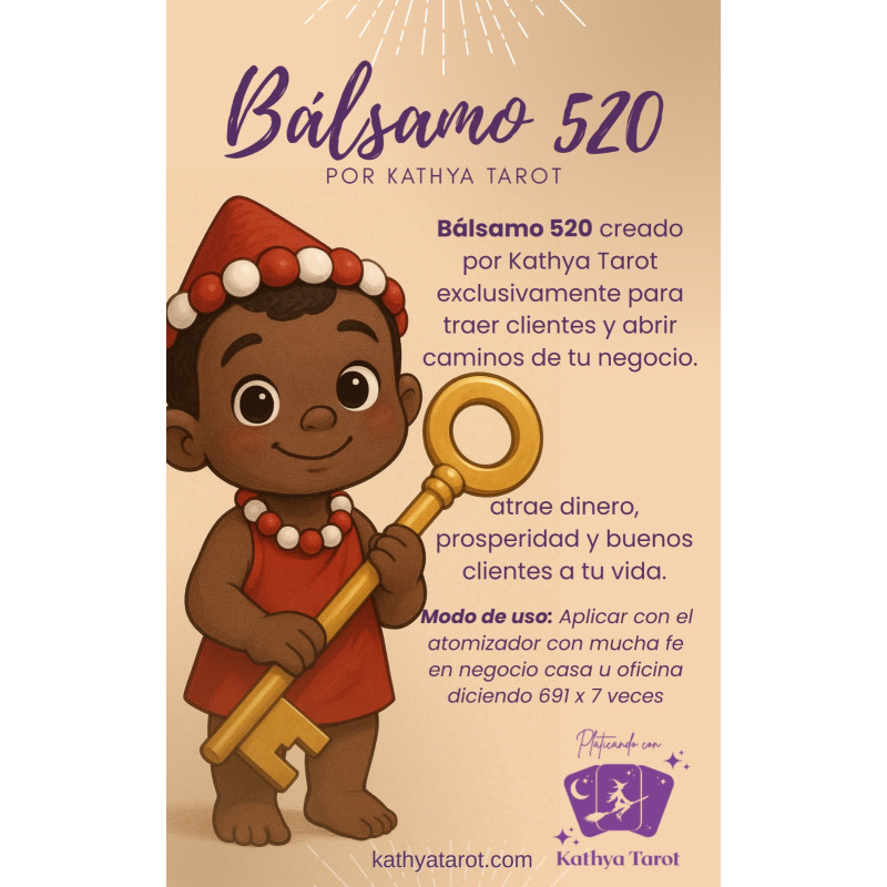 La loción 520 es una locion creada por KATHYA TAROT🧙🏽♀️ especialmente diseñado para atraer abundancia, prosperidad y fertilidad en tus negocios , abre tus caminos y destranca tus negocios para atraer buena suerte y clientes , activada con el Código Sagrado 520 que quiere decir la llegada de dinero inesperadamente, cada que la utilices deberás decir 520 x 7 veces , así estarás activando las más de 50 escencias que la loción 520 contiene , hemos tenido testimonios que a los 5 días comienzan a ver cambios en su vida en la parte económica.😀